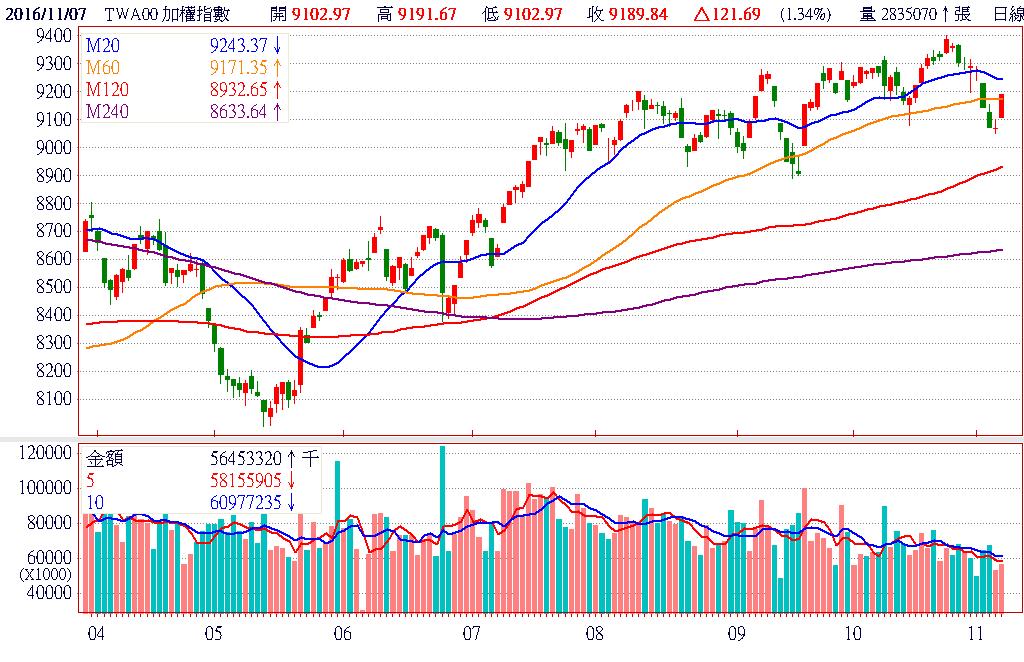 今日FBI出現戲劇性轉變,突然宣布不再調查希拉蕊的「電郵門」案件,美股期貨電子盤應聲大漲,並激勵亞股提前上演慶祝行情。台股則在塑化、水泥及鋼鐵等原物料權值股領漲帶動下,大漲逾百點,順利收復季線。考量月線已下彎,加上在周三美國總統大選開票前仍存有不確定性,明日即便延續反彈力道,也將面對不小的上檔壓力。終場加權指數以9189.84收,上漲121.69點 ,漲幅1.34%,市場成交總金額553.19億元。