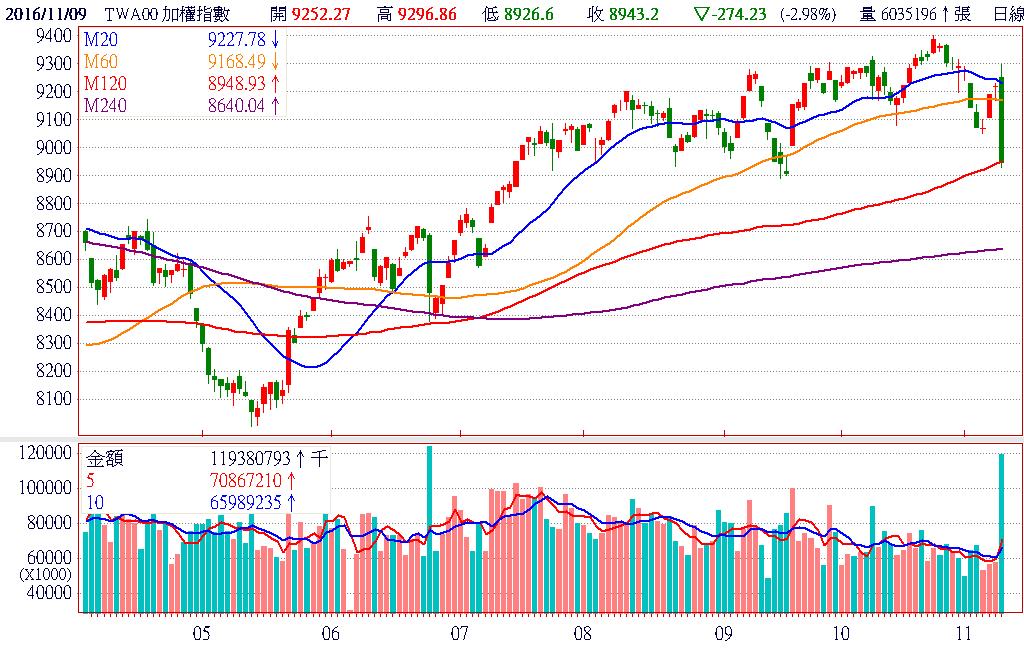 今年選舉再次上演大驚奇,繼英國意外脫歐後,川普今日也大勝希拉蕊當選美國總統,被視為衝擊金融市場大動盪的黑天鵝。不過,觀察兩次選舉之後,市場似乎都有利空出盡的反應,國際資金均迅速重返風險性資產(台股盤後美股電子盤跌幅收斂、債券及黃金價格走跌),預期原先還在觀望的買盤應會陸續回籠,今日超跌的台股,明日有望開始反彈。終場加權指數以8943.20收,下跌274.23點 ,跌幅2.98%,市場成交總金額1192.87億元。