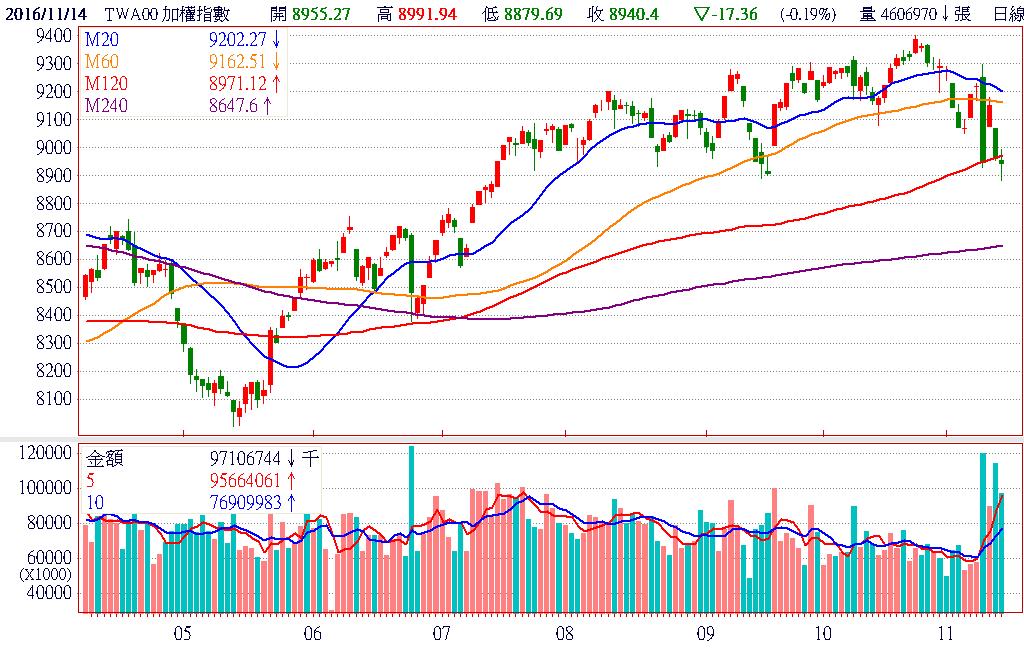 川普當選美國總統後,市場對美國升息速度加快預期開始升溫,激勵美元指數突破前高衝上99.68的新高,加上川普調降企業稅及貿易保護主義的政策主張,促使熱錢資金紛紛從亞洲抽離回流美國,造成近期亞股成為外資提款機,又以半導體及蘋概股為重的台股最為明顯,自上周三以來四個交易日已大賣540億元。預期在外資賣壓結束前,台股都還有向下回測的風險。終場加權指數以8940.40收,下跌17.36點 ,跌幅0.19%,市場成交總金額970.13億元。