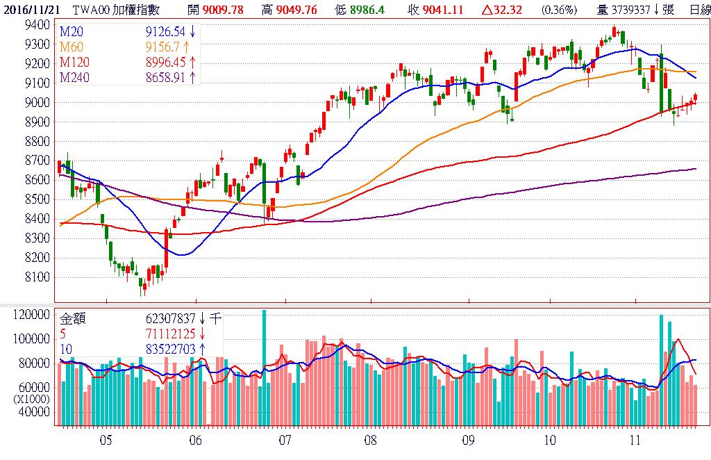 上周聯準會主席葉倫發表演說後,市場對於美國12月升息預期進一步升溫,公債殖利率再飆波段新高。這些從債市轉出的資金,有部分轉向前景轉向樂觀的股市,成為美股頻頻創高的主因,像是上周五費城半導體指數就再攻新高。由於台股漲跌與費半指數相關係數高達8成,有助吸引國際資金買盤的目光,稍稍化解台幣貶值所引發的熱錢賣壓。終場加權指數以9041.11收,上漲32.32點 ,漲幅0.36%,市場成交總金額622.22億元。