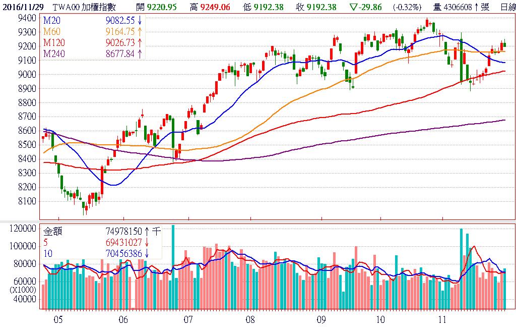 美元指數持續震盪,台幣貶值壓力稍減,連帶外資抽資金的急迫性也跟著降低,帶動台股早盤緩步墊高,直到下午一點過後才出現摩台壓低結算、指數急殺的情況。隨著美股四大指數陸續創高,與美股連動性頗高的台股,在外資籌碼回補慣性改變之前,本波反彈行情將會延續下去。終場加權指數以9192.38收,下跌29.86點 ,跌幅0.32%,市場成交總金額748.74億元。