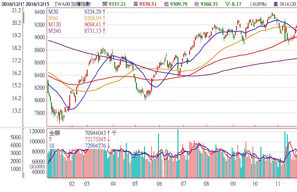 聯準會決議升息一碼,明年將升息三次,較市場普遍預期的兩次為多,聲明公佈後美元指數走強、美債殖利率上漲、美股下跌,連帶影響亞股跟著開低。不過,就德股開盤後改寫波段新高來看,資金持續從債市流往股市的趨勢並未改變,顯示市場仍勇於追求風險性資產,升息利空似乎已反應完畢。另因聯準會升息頻率加快,對壽險股反而是利多,激勵今日國泰金(2282)、中壽(2823)的股價均出現大漲,成為收斂台股跌幅的功臣。終場加權指數以9360.35點作收,下跌8.17點 ,跌幅0.09%,市場成交總金額708.49億元。