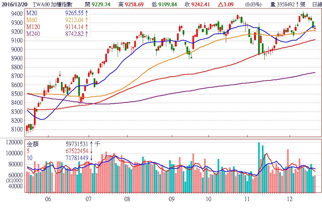 受外資放假影響,本周台股量縮已成定局,歷經前一日大跌後,今日已明顯止穩,甚至出現拉尾盤的表現,表示調節賣壓減輕。由於德國股市已領先創高,若晚間美股也跟著創高,那台股就有重新轉強的機會,加上明日台指期結算,指數波動幅度也將隨之擴大。終場加權指數以9242.41點作收,上漲3.09點 ,漲幅0.03%,市場成交總金額596.42億元。