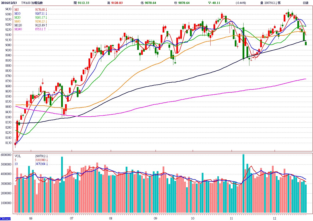受到美股攻不上2萬點影響下,外資長假前縮手,不只美股回檔,台股最近處於無量下跌的窘境,已經跌破月線、季線及半年線,盤面有轉弱得疑慮,未來回檔只要能守住8878點支撐以上,長多格局尚未被破壞。現短線上法人認養的中小型股較有表現,明年中長線仍看好美國升息循環股及原物料走勢。終場加權指數以9078收,下跌 40點 ,跌幅0.44%,市場成交總金額525億元。