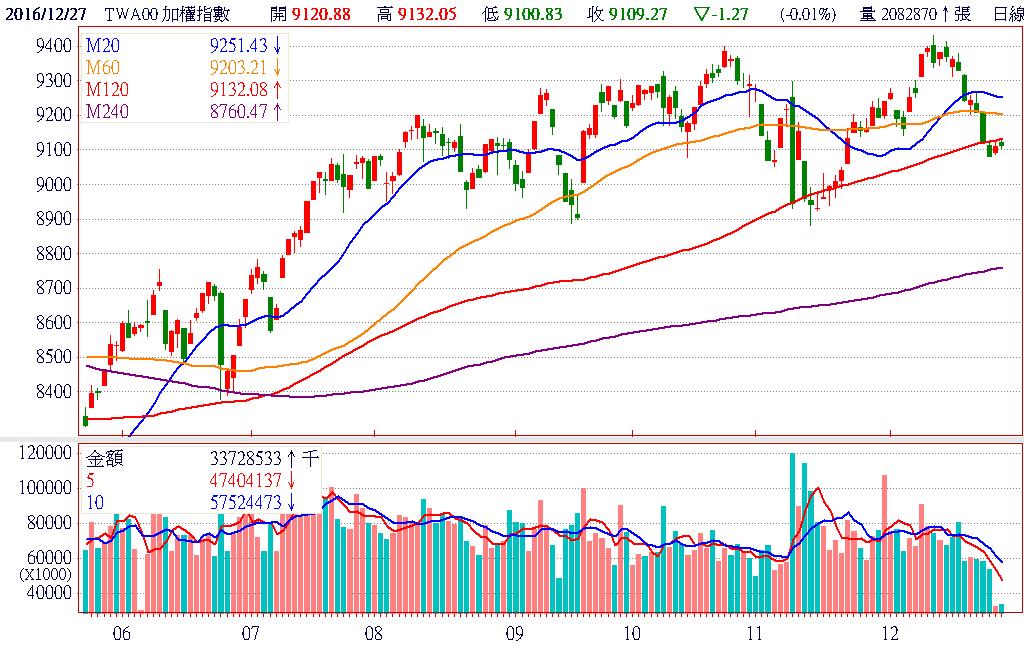 受台幣連九貶影響,外資對台股也已連八賣,加上多數外資仍在放假,造成加權指數仍難掙脫量縮整理的格局,預期本周成交量將創金融海嘯以來的同期新低。在成交量低迷下,大型股已進入冬眠狀態,連帶台股波動度也跟著大幅降低,增添操作難度。目前只能期待明年外資歸隊及股市相關稅收調整後,能夠扭轉整個投資氣氛。終場加權指數以9109.27作收,下跌1.27點 ,跌幅0.01%,市場成交總金額334.97億元。