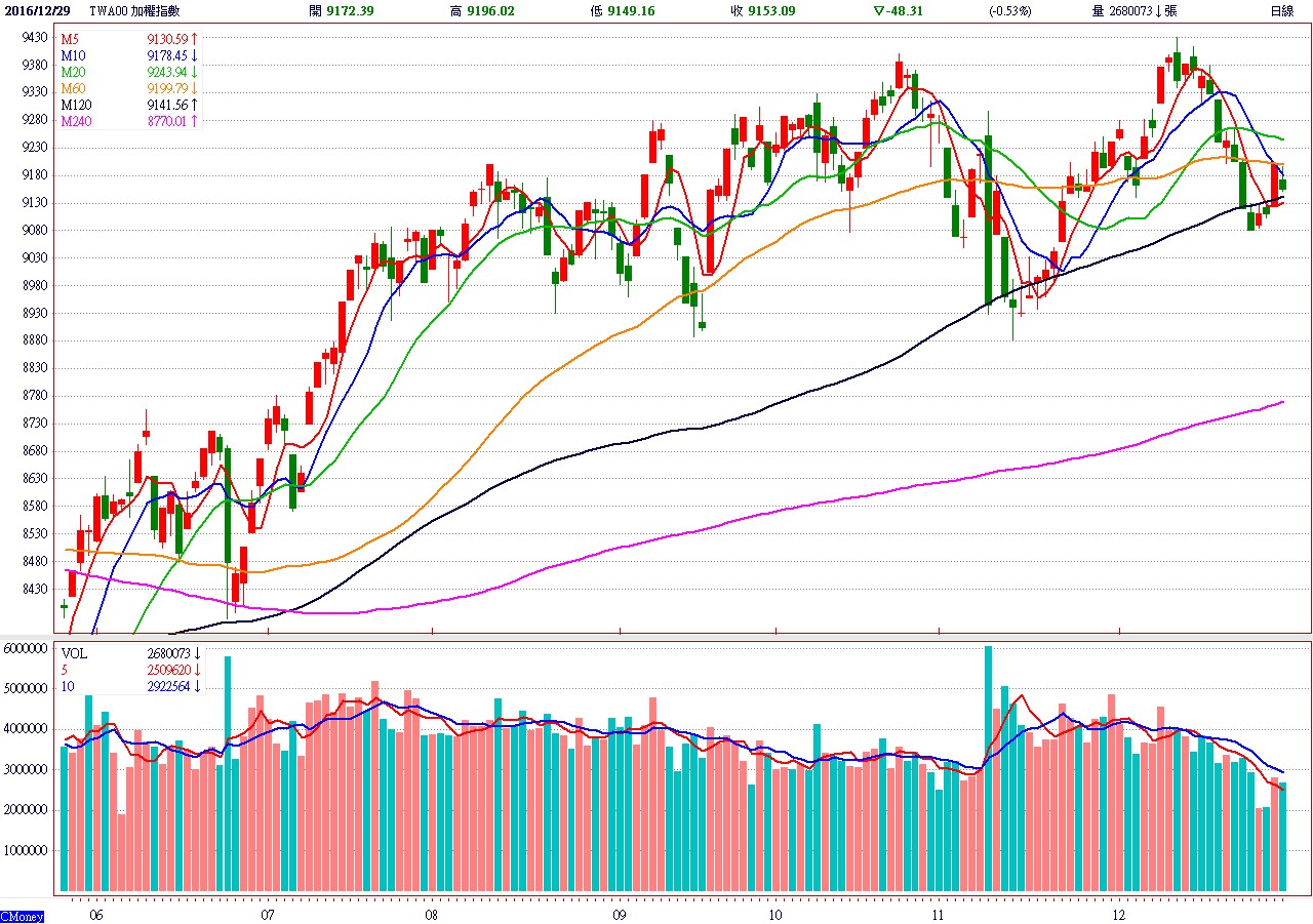 本月隨著各國央行會議結束,政策上內容大致符合預期下,在短期內無重大變數干擾下,在年底前市場資金動能減緩疑慮暫時銷除。隨著時序進入歲末年終,國內外年節氣氛漸濃,市場交投顯得輕淡許多,所幸歐美股市能維持強勢格局,在美國經濟數據樂觀下有助於FED在明年升息腳步,預計台股在第一季仍有高點可期。終場加權指數以9153收, 下跌48點 ,跌幅0.53%, 市場成交總金額521億元。