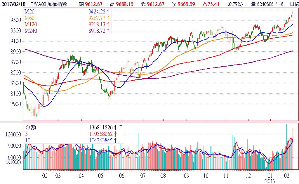 由於眾所期待的川普調降企業稅利多政策即將出台,全球股市提前上演慶祝行情,美股道瓊、那斯達克、標普500等三大指數改寫新高,台股也順勢放量創波段高。唯一的敗象則是在開紅盤後一路強勢狂飆的櫃買指數,今日開高走低收最低,不僅終止日K線連續紅K走勢,更在高檔留下帶上影線的黑K,研判短線可能需要先進入整理。終場加權指數以9665.59作收,上漲75.41點 ,漲幅0.79%,市場成交總金額1333.38億元。