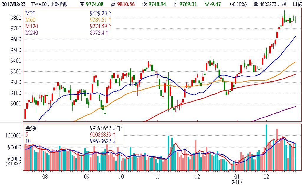自上周加權指數攻上9800點後,投信、官股券商開始轉為賣超,上檔壓力明顯加重,讓指數遲遲無法站穩整數關卡,個股的波動度也跟著限縮,連帶提高操作難度。所幸台幣仍維持升值趨勢,外資持續買超現貨,有利延續台股的多頭走勢,短線仍可順勢偏多操作,唯在類股輪動快速下,進出的節奏也要加快。終場加權指數以9769.31收,下跌9.47點,跌幅0.10%,市場成交總金額991.66億元。