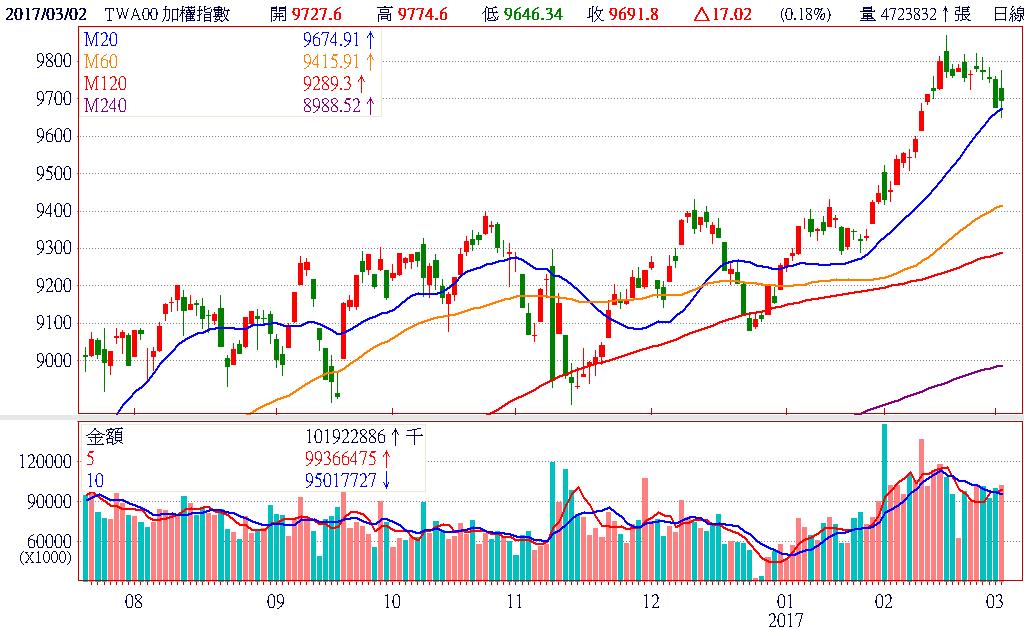川普昨日首場國會演說,重申減稅及1兆基礎建設的政策方向,雖未提出具體細節,反到給了市場更大的想像空間,加上CNN/ORC進行的最新民調顯示,超過75%的美國民眾對該演說反應正面,近2/3相信總統的政策優先順序對國家有益,激勵美股再度上演大漲的慶祝行情,道瓊、那斯達克、標普500均改寫新高。受此多頭氣氛帶動,今日台股直接跳空開高,但盤中買盤卻不如預期的積極,賣壓也出乎意料的大,導致加權指數開高走低,即便尾盤收小紅,硬是拉回月線之上,日K線也已是連五黑。終場加權指數以9691.70收,上漲17.02點,漲幅0.18%,市場成交總金額1018.16億元。