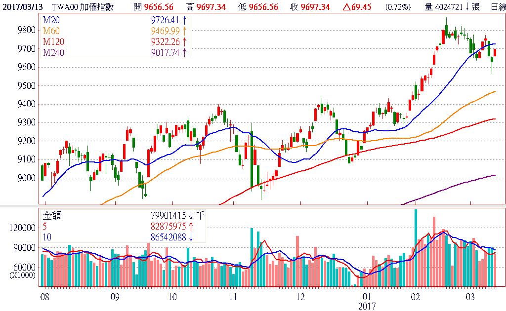 上周末傳出ECB開會時曾討論是否在QE結束前升息,激勵歐元大漲,加上美國商務部長聲稱將在兩週內重啟北美自由貿易協定談判,日本會是美國優先進行貿易談判的對象,又導致美元對大多數貨幣走貶。隨著美元轉弱,舒緩熱錢撤離亞洲的壓力,進而帶動今日亞股幾乎全面上漲。不過,加權指數及櫃買指數的成交量均較前一個交易日減少,呈現反彈無量的偏弱表現,明日能否延續彈升走勢,仍有待觀察。終場加權指數以9697.34做收,上漲69.45點,漲幅0.72%,市場成交總金額797.82億元。