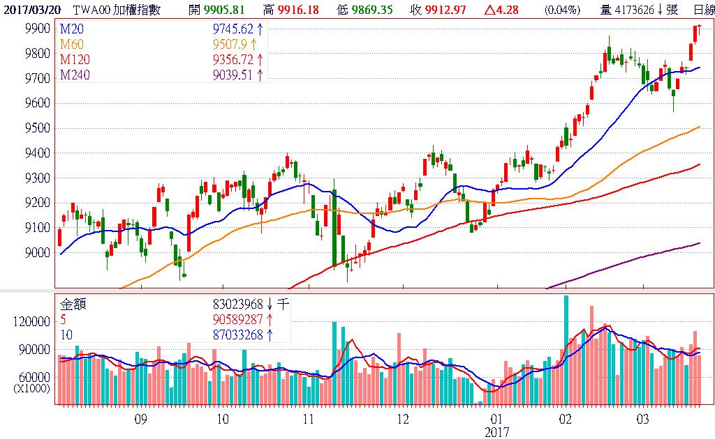 自上周開始回檔的美元指數,已陷入100的保衛戰,非美貨幣則順勢轉強,像本周台幣匯率就再創30.4的新低,得以讓外資延續對台股的買超,並推升加權指數盤中續創波段新高,朝萬點之路又跨了一步。不過,以目前藉由拉抬基期較低的權值股股價來推升指數的盤面結構,即便近日真的攻上萬點,恐怕也難站穩,增添追高操作的風險。終場加權指數以9912.97點,漲幅0.04%,市場成交總金額826.53億元。