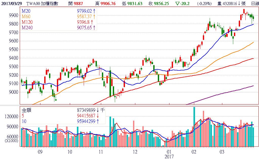 股可望維持高檔整理的多頭格局,甚至不排除再攻萬點的可能性。終場加權指數以9856.25點,下跌20.20點,跌幅0.20%,