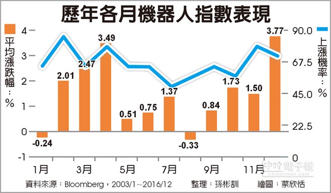 4月全球機器人及自動化大展陸續登場,美國芝加哥自動化展已於6日結束,24日~28日將由德國漢諾威工業展接棒,增添機器人概念股的題材性。就歷史股價觀察,市場的確對展覽題材會做出正向的反應。根據Bloomberg統計,自2003年以來,ROBO GLOBAL機器人指數各月的上漲機率都超過5成。其中,4月上漲機率為78%,僅次於2月,平均漲幅則達3.49%,超越2月的2.01%。預期國內機器人指標股樺漢(6414)、上銀(2049)、研華(2395)及凌華(6166)等,本月股價也將有所表現。