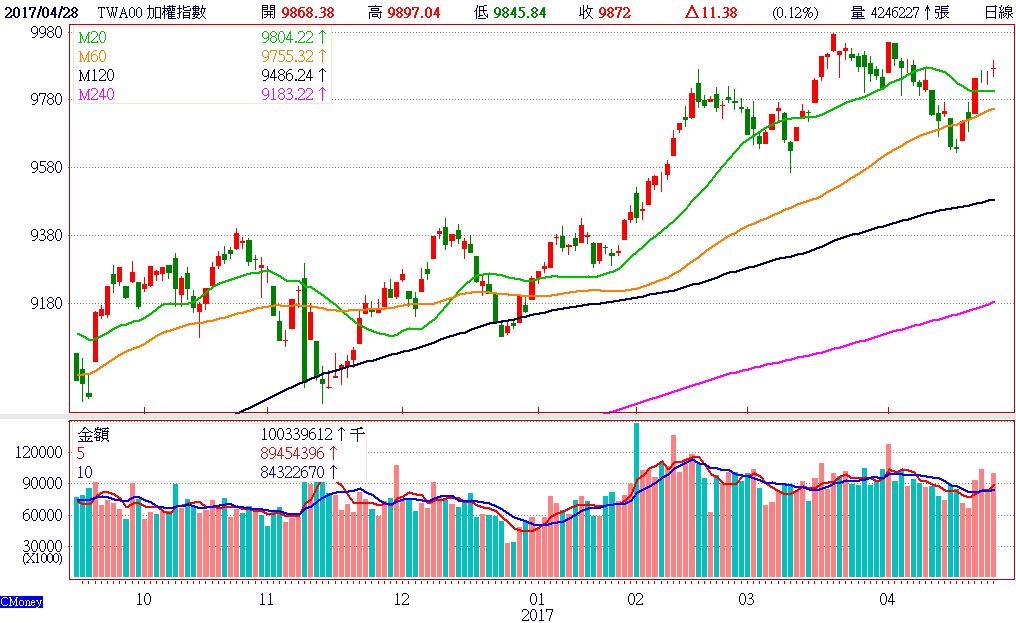 今日是周末及連假前的最後交易日,照理講應會有不少節前賣壓出籠,但終場台股仍以小漲作收,成交量更放大至近千億元,似乎有點不尋常。另因外資期現貨持續站在買方,股王大立光(3008)股價也創收盤新高,有助維繫市場的多方信心,投資人下周仍可順勢偏多操作。終場加權指數以9872.00點,上漲11.38點,漲幅0.12%,市場成交總金額986.55億元。