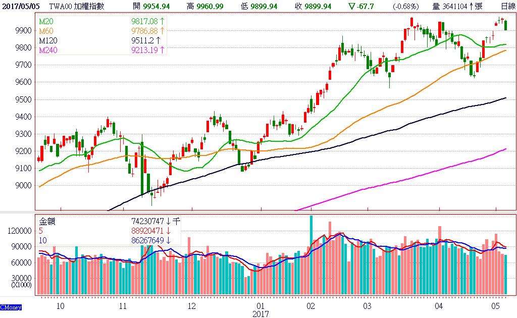 歐美股市雖持續多頭、高檔盤堅格局,但大盤指數因連日逼近萬點大關卻未攻過,在二日連假加重市場投資人憂慮盤勢變局下,因此於連十日收紅、創高後,快速反轉收黑,一舉跌回5日均線之下,台股短線續探回檔新低可能性升高。籌碼面,外資期貨轉向賣超,淨賣超口數放大達3,252口,未平倉淨多單部位,減持至55,164口,現貨也同步轉為賣超9.7億元。終場加權指數以9899.94點,下跌67.70點,跌幅0.68%,市場成交總金額741.36億元。
