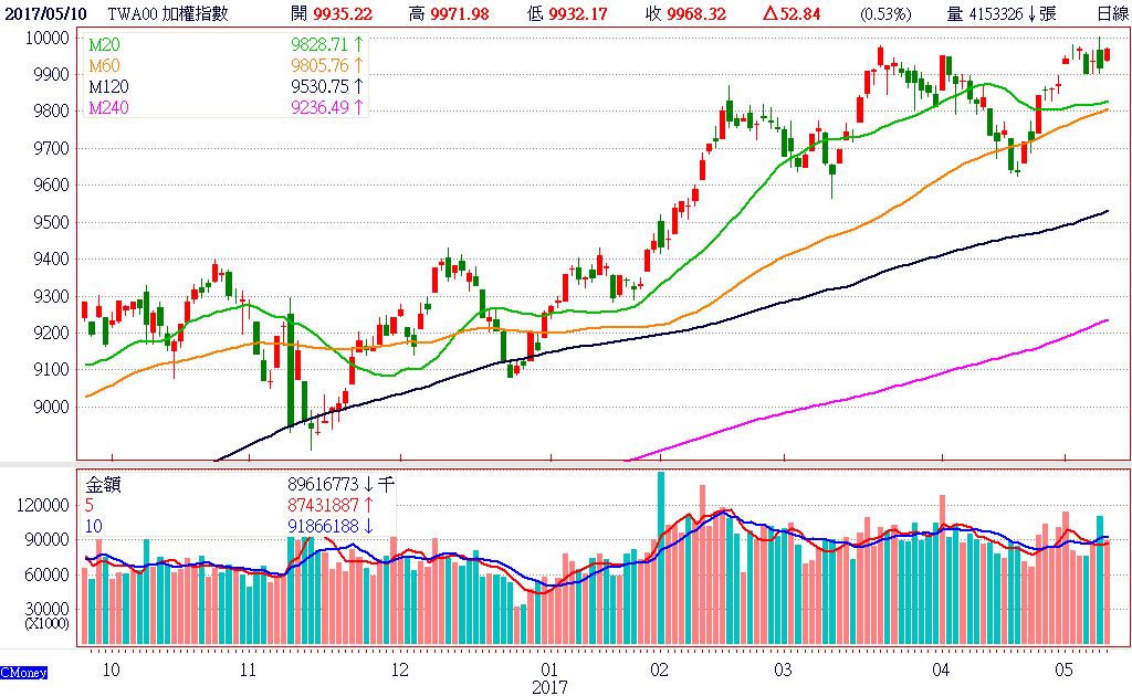 現。終場加權指數以9968.32點,上漲52.84點,漲幅0.53%,市場成交總金額898.02億元。