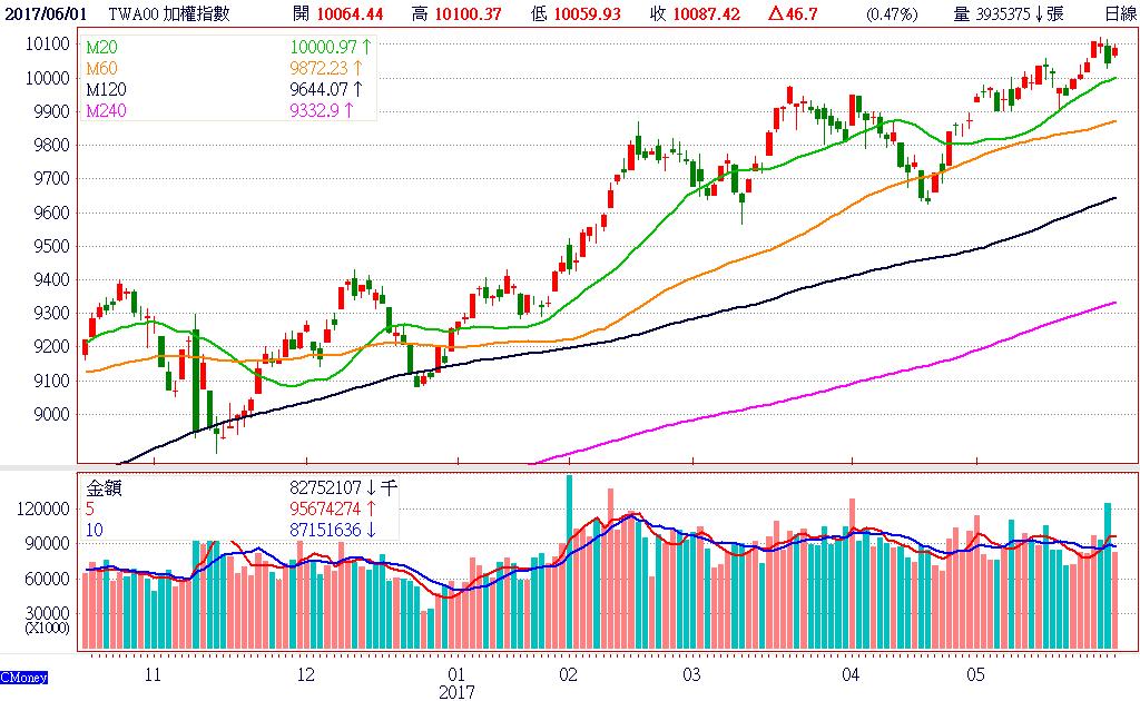 度,市場投資人已開始打上一個大問號。終場加權指數以10087.42點作收,上漲46.70點,漲幅 0.47%, 市場成交總金額815.97億元。