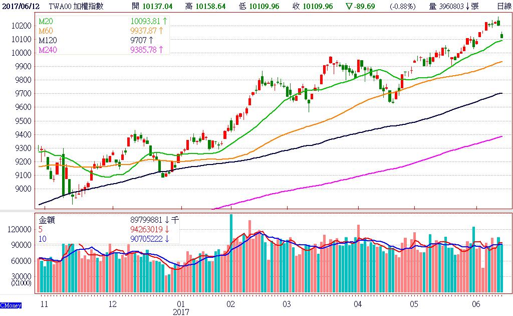 台灣產業界仍持續面臨「五窮六絕」陰影籠罩;市場靜待美國FED六月升息決策會議結果出爐;台股大盤目前因受向來與台股走勢連動性高之美股科技股指數,短線大幅回檔衝擊影響,因此跟進、出現短線跳空大跌走勢;一旦美國科技股持續走弱,大盤指數後市恐將開始面臨市場空方逐漸加重壓力測試。終場加權指數以10109.96點作收,下跌89.69點,跌幅 0.88%, 市場成交總金額896.96億元。