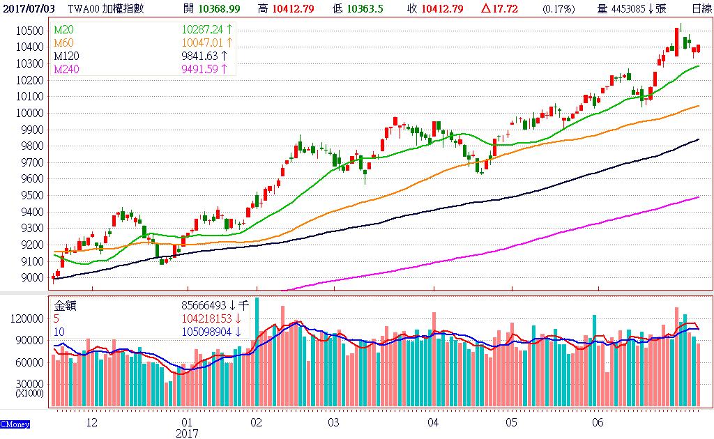 儘管台股市場多方,現階段依舊試圖成功守盤,將指數力撐於重點整數關卡-10300點之上,力求維持大盤短多型態、多頭排列格局不變。然而,預料在美國科技股指數、指標性科技股,短線後市走勢續偏弱勢可能性仍較大下,台股目前依舊不容易「特立獨行」,走出另一段市場多方殷殷期盼的大波段漲升行情。盤面成交量未見明顯放量以前,後續對場上多方最好的結果,恐仍將以「橫盤整理」型態可能性最高。終場加權指數以10412.79點作收,上漲17.72點,漲幅0.17%,市場成交總金額856.66億元。