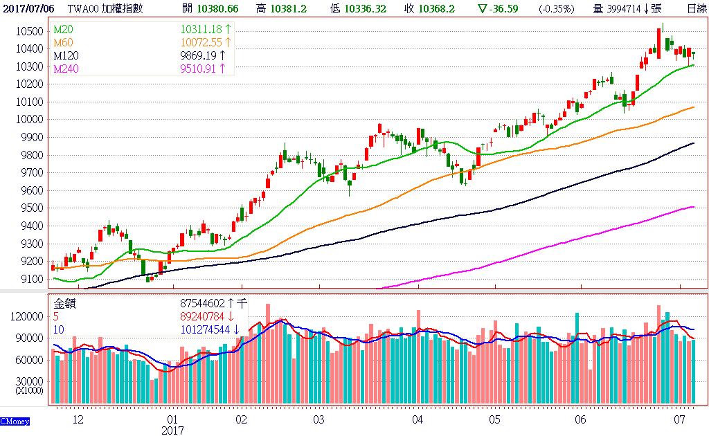 由於美股指標性科技股、科技類股指數,現階段仍續偏弱勢格局,多方暫時無法重新奪回盤勢主控權;如此一來,當然也就不利於向來與其表現連動性高的台股後市,預料大盤指數短線後市,仍然有可能持續橫盤整理,靜待多方重新掌權。另一方面,自6月27日以來至7月6日為止的8個交易日,大盤指數呈現明顯反轉跌勢,短線最大波段跌幅達2.29%;而同期間新台幣匯率,亦貶值最大達0.88%幅度。因此,難免會讓人擔憂,一旦接下來新台幣貶值勢頭無法終止時,是否表示外資仍持續「用錢投票」、「棄守台股」?終場加權指數以10368.2點作收,v下跌36.59點,跌幅0.35%,市場成交總金額875.44億元。