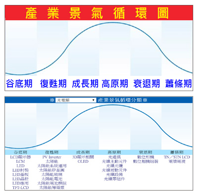 我們可以觀察圖一:產業景氣循環圖分類中可以知道,產業景氣可簡單區分為谷底期、復甦期、成長期、高原期、衰退期、蕭條期。股市的各大產業中景氣循環是周而復始的,但週期的波動時間各不相同,而且不一定有規律的時間,但又具備循環特性,所以統稱為景氣循環。
