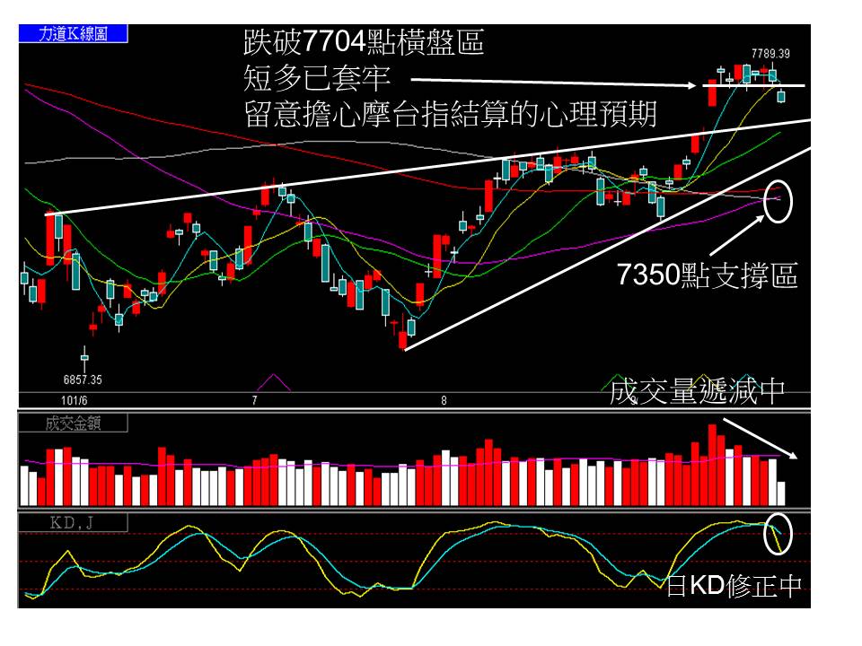 受到FED費城分行總裁質疑QE3的效果,道瓊下跌101點,跌破10日均價支撐。亞股開盤走弱,台股同步受影響而開低,適逢周四即將進行摩台指最後結算的因素干擾,開低走低也跌破10日均價,進入日KD死亡交叉後的修正,頗有複製道瓊的走勢。