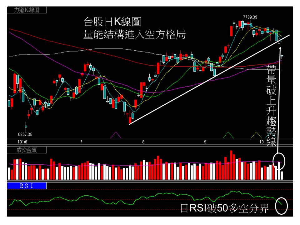 台股因雙十國慶休市,累積的賣壓一次宣洩,早盤跳空大跌破上升趨勢線,雖然在