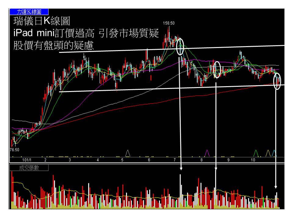 2012年稅後EPS約12.6元,2013年稅後EPS約12.7元,換言之,未來成長率不高,目前本益比約10倍屬合理,既然如此,就表示如果大盤沒有往上拉高空間的話,那就得先拉回,以便創造將來上漲的空間。