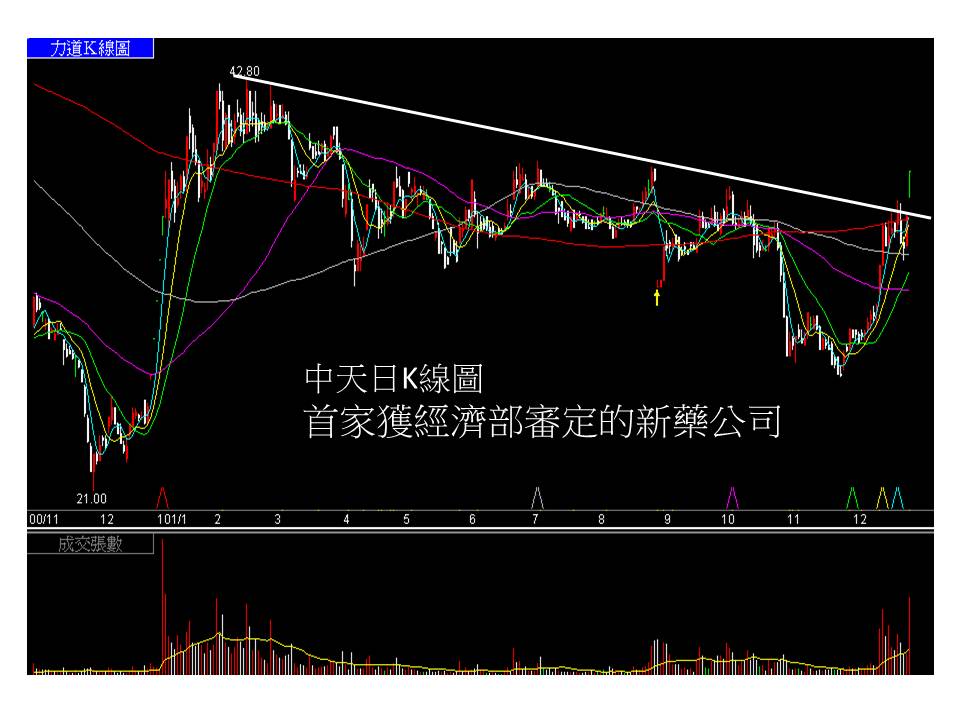 中天集團旗下的合一(4743),短短三周大漲一倍,刺激中天也帶量突破下降壓力線。