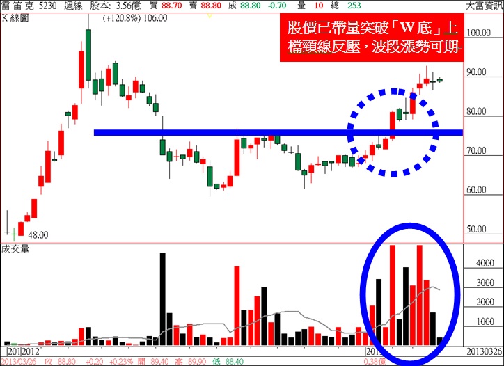 雷笛克2013年的業績、營收與獲利的成長力道相當多元,主要有:(1)原先主要產品用於商照、戶外等高功率LED燈具透鏡,產業成長連結LED燈具數量,且透鏡佔成本比重低(5~7%左右),故價格跌幅有限,此一市場板塊後市預估仍可穩健成長挹注。(2)擴大透鏡應用產品線至「全周光LED燈泡」,刻意擴大產品線,以往公司較少著墨的LED燈泡,因全周光應用趨勢,使得透鏡的生產難度大幅提升。在看好後市的市場發展性下,雷笛克亦積極投入相關開發工作,目前所出廠的產品單價普遍較同業低了20%~30%左右。由於今年全球的LED 燈泡將可望因為零售價格的持續下滑,而大舉衝高消費者的購買銷售數量,預料將會有助於雷笛克下半年的營收成長。(3)雷笛克於2012年底切入的消費性產品,由於該項產品與傳統燈具產品價差僅多了不到5~10%,市場消費者接受度普遍都相當高,因此預估該產品對公司營收獲利的貢獻度將可有效延伸至今年全年度。預估雷笛克(5230)今(2013)年EPS(每股稅後盈餘)約可達6元以上,目前股價本益比約15倍左右。
