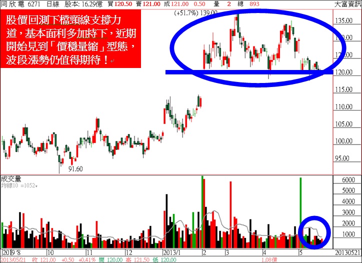 不過,近期由全球LED產業美國大廠-Cree推出不到10美元一顆的「LED燈泡(對應40W省電燈泡照明亮度)」,所引發的一波LED照明產品價格調降風潮,其實對包含台灣在內的全球LED燈泡品牌廠而言,其實未嘗不是一件好事,正代表著未來全球LED燈具在整體照明市場的滲透率,將會受惠於產品價格降價效應,而在未來幾年內見到加速提高結果。預估同欣電(6271)今(2013)年每股稅後盈餘(EPS),在LED照明燈泡的滲透率以及出貨數量,仍可望維持穩定增加榮景的前景展望下,約可達8.7元左右,目前市場股價本益比約13.9倍左右。