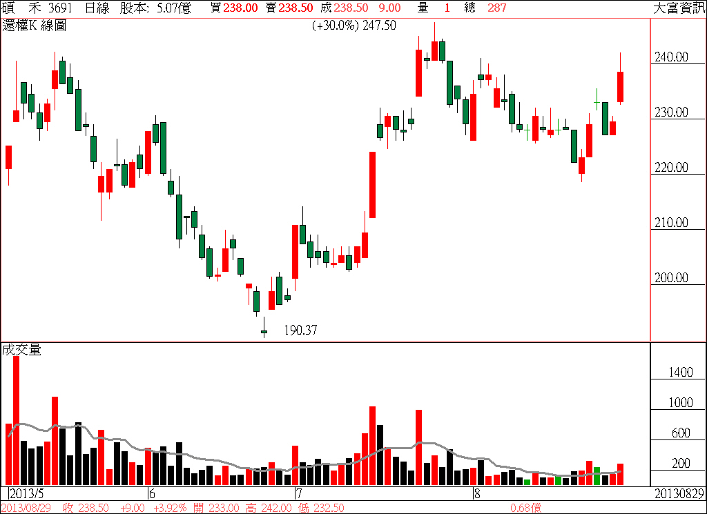 碩禾電子(3691)表示, 8月份正銀導電漿料的出貨量正式突破3噸,創下歷史新高,受惠顧客需求活絡,出貨量逐月放大,下半年有機會挑戰20噸大關,營收及獲利也因正銀大量出貨可提升。碩禾也表示,除日本電廠有初步進展外,碩禾在本月發放現金股利每股5.5元及股票股利1.5元,現金股利2.42億元與股票股利661萬8821股。碩禾除轉投資100%持股日本電廠有初步進展外,受惠顧客需求活絡,本月正銀的出貨量創新高,正式突破3噸。另外,碩禾增資發行新股後實收股本超過5億元增加流通性市值可望提升。