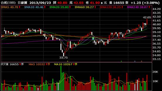 台泥後續動能依舊,先看42.5~43元壓力區,如帶量突破,則看46~48元。