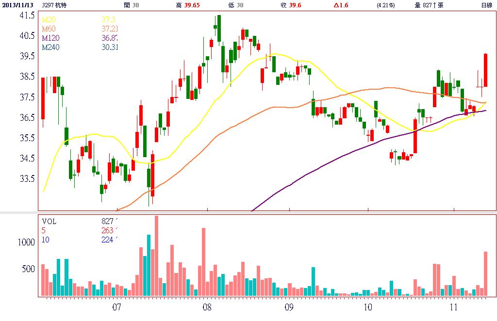 隨今年IP Cam需求爆發,安控族群平均獲利成長幅度都在2-3成以上,其中以黑馬之姿竄出的杭特(3297),在成功轉型至IP CAM廠後,營運出現明顯的變化,從2011年來毛利率呈現逐季走升的驚人表現,目前泛IP的營收比重已拉高至8成,前三季合併營收年增率8 %,毛利率攀升至35%,推升獲利年增率達1.3倍,累計EPS2.73元,賺嬴去年全年的2.07元。考量成長率領先同業,加上股價本益比相對偏低,未來將有見到落後補漲的比價行情。