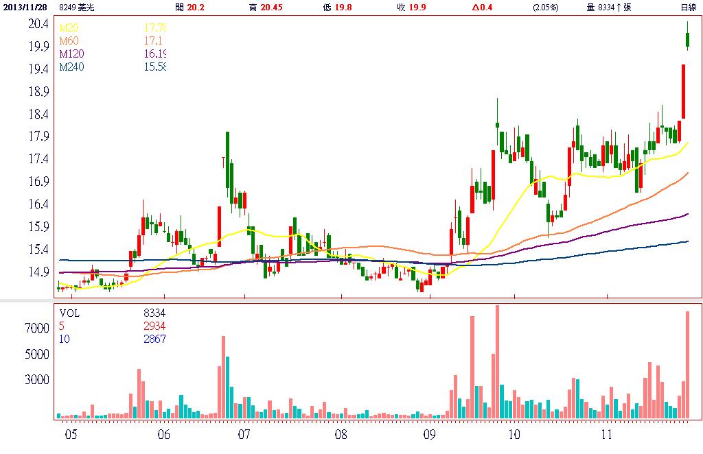全球最大彩色接觸式感測模組(CISM)廠菱光(8249),由於客戶上半年拉貨太過保守,導致第三季出現大追單的情況,推升營收、毛利率及EPS 大躍升,單季獲利較上半年倍增。目前主力產品CISM 除了應用在多功能事務機與印表機,也朝向3D 領域發展,區域型感測模組(AreaSensors)也有應用在車用影像感測模組,順勢搭上此波汽車電子的熱潮。另因菱光隸屬東元集團一員,隨時序進入年底集團作帳旺季,增添股價向上攻擊的想像空間。