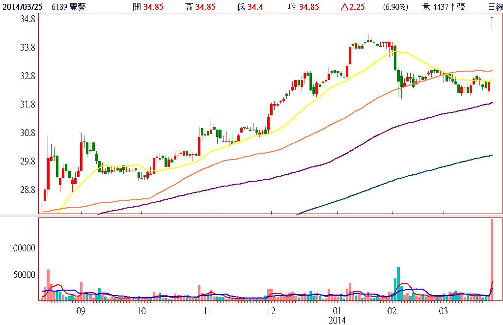 IC通路商豐藝(6189),宣布配發現金股利2.9元,加上0.1元的資本公積,在超高殖利率誘因下,今日已吸引買盤大舉搶進,帶動股價放量衝高,若以收盤價換算現金殖利率仍高達8.6%,未來股價應還有走揚的空間。今年營運展望方面,首季受惠面板、電源管理IC、特定應用IC等產品組合優化,毛利率可望維持與去年同期水準,另因公司將轉進特定應用產品,對於第二季的展望上也保持審慎樂觀的看法。