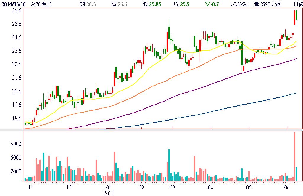 來自車用的營收占比將逐季成長。近期因身為宣德(5457)上游廠,搭上高速傳輸介面Type c的熱門題材,激勵昨日股價出現放量強攻的表態走勢,研判在量縮休息後多頭將有再攻的可能。