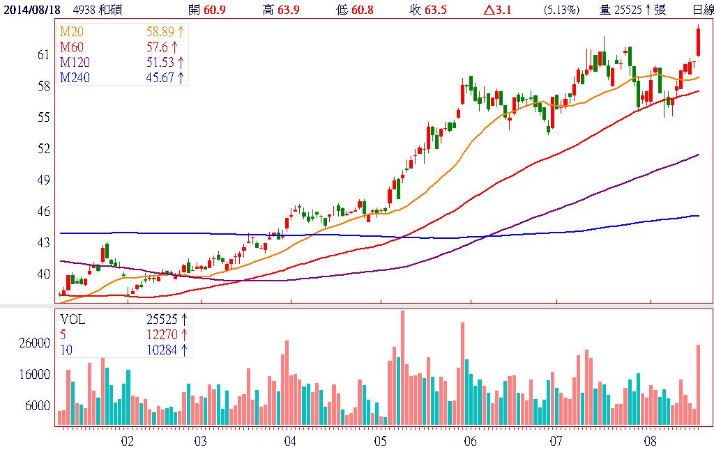 隨iPhone 6發表日接近,蘋果股價有望挑戰分割後新高,有助帶動國內蘋概股同步上演慶祝行情,身為4.7吋iPhone 6第二大組裝廠的和碩(4938),今日股價已領先創下波段新高。另法人預期有望取得35~40%訂單,優於市場原預期的20~30%訂單,可望增添通訊產品營收成長的力道,彌補NB出貨量下滑的負面干擾因素。