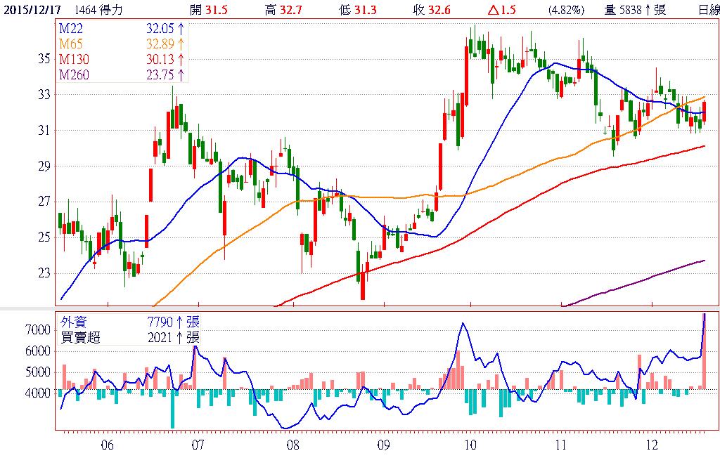 織布廠得力(1464)則將與成衣廠台南(1473)策略合作,攜手前進越南設立織布、成衣代工一貫化代工廠,藉由台南在東南亞布局經驗豐富及得力所掌握運動品牌客戶,拓展全球運動市場的商機大餅。凱基投顧也看好得力將是UA持續高成長趨勢下的主要受惠者,預估明年獲利年增40%,將是明年紡織類股中成長動能最強的公司。隨著越南新產能陸續開出,預估未來三年產能每年均可增加15-30%,增添長線營收的成長空間。就近期股價技術面觀察,得力也算是紡織股中最強勢的一檔,股價仍在半年線之上,接下來只要向上突破攻擊,各天期均線很容易就轉為多頭排列,進而展開新一波多頭行情。
