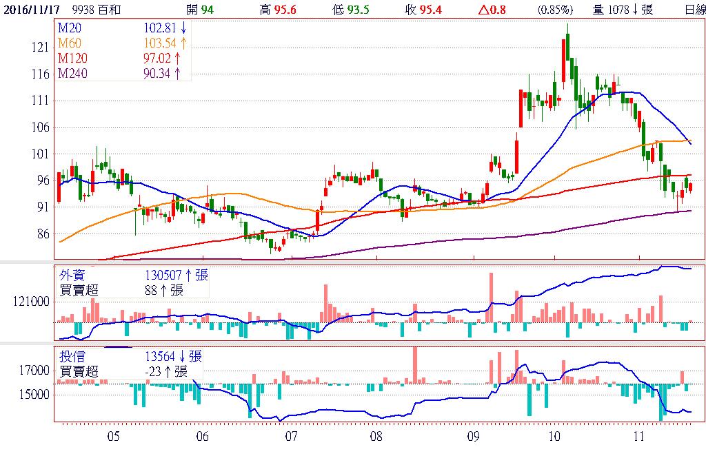 另因公司美元部位多維持在總營收的50%,搭配生產基地以越南盾、印尼盾、港幣及人民幣,或現況裁量以美元支付,以降低匯損。近期美元走強、亞幣轉貶的趨勢,對於公司未來的獲利表現相對有利。觀察法人籌碼可發現,在百和股價跌至年線後,投信停損賣壓已明顯減輕,甚至轉為買超,顯示十月營收不如預期的利空已反應差不多。隨著近期族群股價開始跌深反彈,未來應有跟漲的機會。