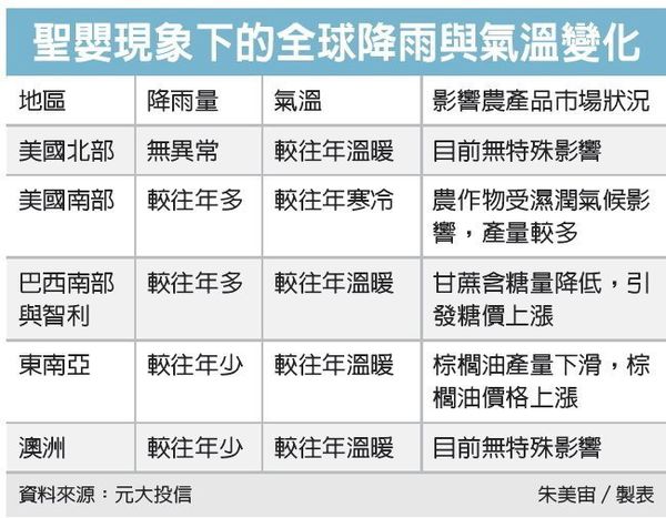 由於爆發聖嬰現象的機率大增,市場已開始上修亞洲及非洲地區農作物的風險預測,例如羅布斯塔咖啡、糖、可可、棕櫚油等。目前已進入第一階段限水的台灣,下半年是否會因此而出現旱災,也是投資人該留意的潛在風險。