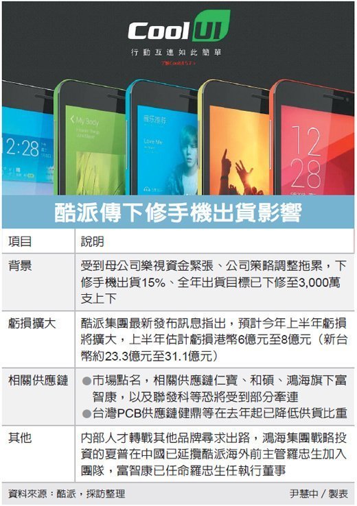 受中國手機電信補貼方案不明朗及市場買氣低迷的影響,中國智慧型手機品牌大廠第一季的在外成品庫存水位較以往都略增1~2周,因此各大廠紛紛下修第一季生產目標及備料目標,以調節庫存水位。今日又傳出中國手機品牌廠酷派,因受到母公司樂視資金緊張、公司策略調整拖累下修手機出貨約15%。此外,高通新晶片缺貨,也讓中國品牌今年推出旗艦機種時程延後,法人預期此波庫存調整將到第三季,相關供應鏈營運表現將被壓縮。
