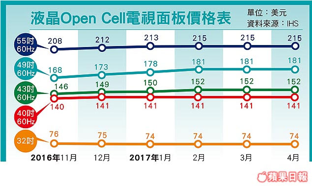 IHS指出,由於近來逐步墊高的電視機成本增長不能完全轉嫁於電視平均售價,電視廠商已設法轉向更有利可圖的尺寸。40吋、43吋電視虧損愈來愈大,造成面板需求減少,要求降價的聲音也愈來愈大。近期一些中國電視品牌開始調低對55吋和65吋的需求,因為面板庫存充足,電視廠商開始重視產品盈利狀況和庫存上升的風險。另因4、5月面板價格維持在高檔,電視廠商虧損壓力大,因此中國電視廠商在5月採購縮手,下修第2季面板需求預估,連帶報價也將有下修的壓力,恐將不利面板相關供應鏈營運及股價表現。