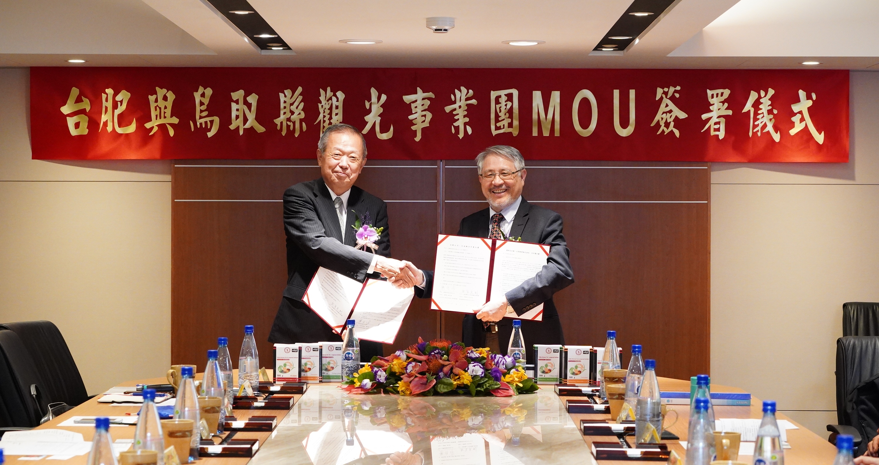 台肥在農糧署署長胡忠一、外貿協會秘書長葉明水、台日關係協會秘書長郭仲熙、日台交流協會首席副代表星野光明及鳥取縣花迴廊西田雄二園長的見證下,董事長康信鴻(圖右)與日本鳥取縣觀光事業團理事長衣笠克則完成簽署合作意向書,期待應用台肥肥料提升日本花卉品質並吸引遊客。