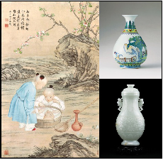 LOT 1117 清乾隆 鬥彩竹石芭蕉玉壺春,預估價160萬至240萬元(右上);LOT 1130 清乾隆 白玉仿古雕饕餮紋雙夔鳳耳蓋瓶,預估價1,100萬至2,000萬元(右下);LOT 3119 郎世寧|照盆孩兒圖,99x62公分,預估價5,000至8,000萬元(左)