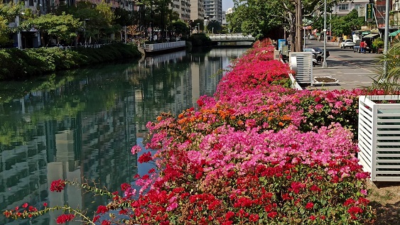 工務局長吳明昌表示,九重葛為紫茉莉科的常綠攀緣灌木,因性喜高溫強光、耐暑性及耐旱性佳,易於栽植,非常適合熱帶氣候陽光普照的高雄,於每年11月至翌年4月綻放豔麗苞片,正值九重葛展現奼紫嫣紅時節,市民朋友不妨留意一下中山四路、國泰路及中正路中央分隔島、民族陸橋及中凱橋兩側、幸福川及愛河沿岸懸垂水面的九重葛風情萬種,九重葛於盛開時常作為綠籬彩繪環境,市府亦利用其枝條懸垂性,栽植於愛河沿岸及旗津路防坡堤岸上,懸垂而下的錦簇苞片,搖曳著生動活潑之氣息。而養工處苗圃自行培育的整型九重葛,擺設於重要景觀節點或活動場所,更是錦上添花。