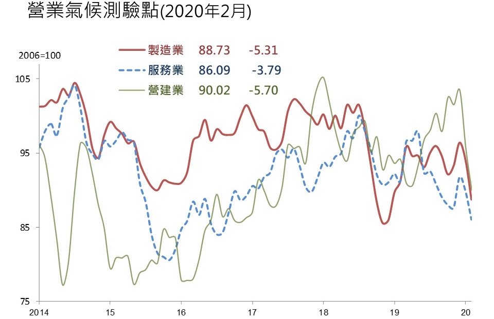 台經院指出,據調查結果,經過模型試算後,2月製造業、服務業與營建業營業氣候測驗點呈現同步下滑。