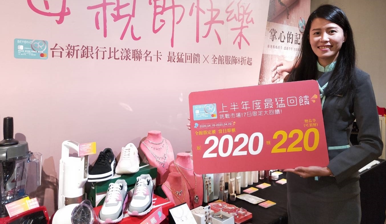 比漾廣場從4月16日起「聯名卡超級週」強勢登場,搶在母親節檔期前,第一周至4月22日,台新銀行比漾聯名卡友獨享七天市場同期最低贈獎門檻滿2020送220贈品券,回饋直逼11%,挑戰市場最優聯名卡!另首四日消費滿5千再多送100贈品券!