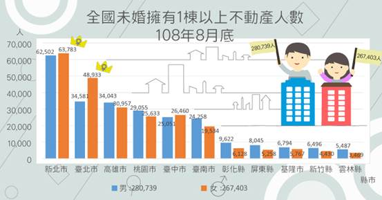 內政部統計顯示,六都以新北市的未婚「宅」男女最多,有將近12.6萬人,其中女性約6.4萬人,男性約6.3萬人,女多於男最多的區域則是台北市,台北市未婚女性擁房的共有4.9萬人,高於男性的3.5萬人,高雄市、台南市與桃園市,則都是未婚擁房男多於女的區域,台中市則是女多於男的區域。