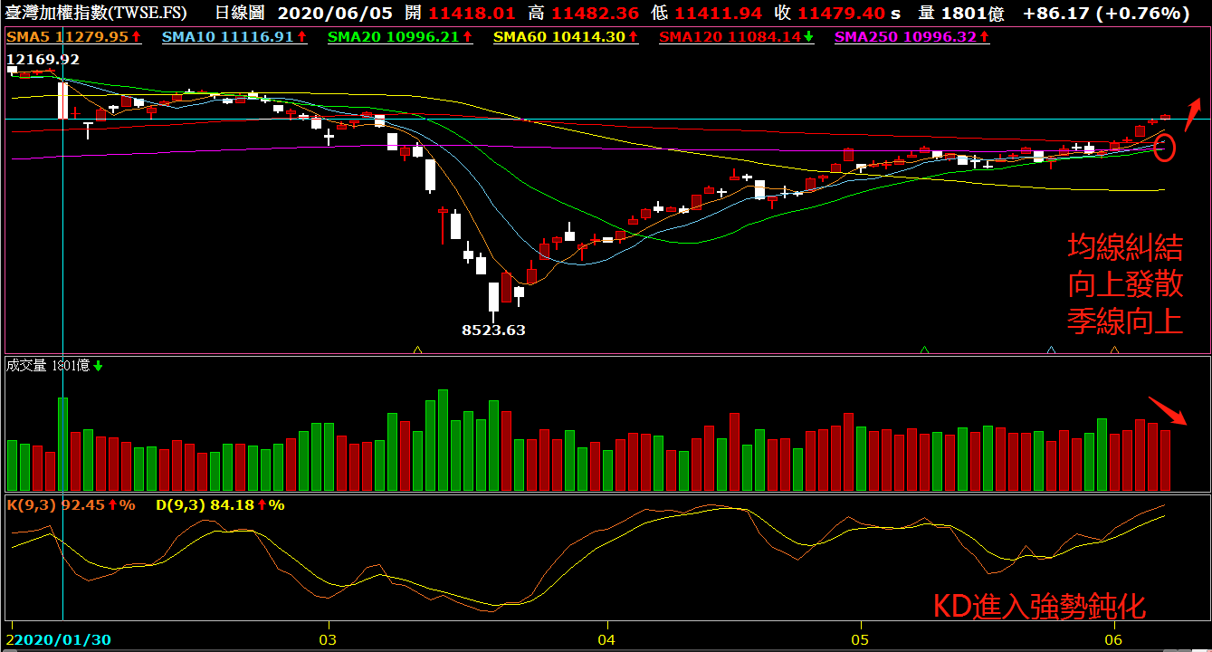 6月5日台灣加權指數漲86.17點,收11479.4點,量縮價漲的實體陽線,創波段11482.36新高點,面對1月30日11421~11933點的大量長黑K,連續2天量縮,理解市場謹慎的心態,屬合理。而多頭也把盤控制的相當穩健,漲的不疾不徐,回顧本周的這五天的漲點,分別為+136.86、+48.91、+192.23、+73.07、+86.17除了周二之外,都滿足十六分之一的甘氏角,尤其週三滿足八分之一的甘氏角,算是留有餘力的攻擊盤,如此保留實力,應該是為了下周三的結算行情做準備。